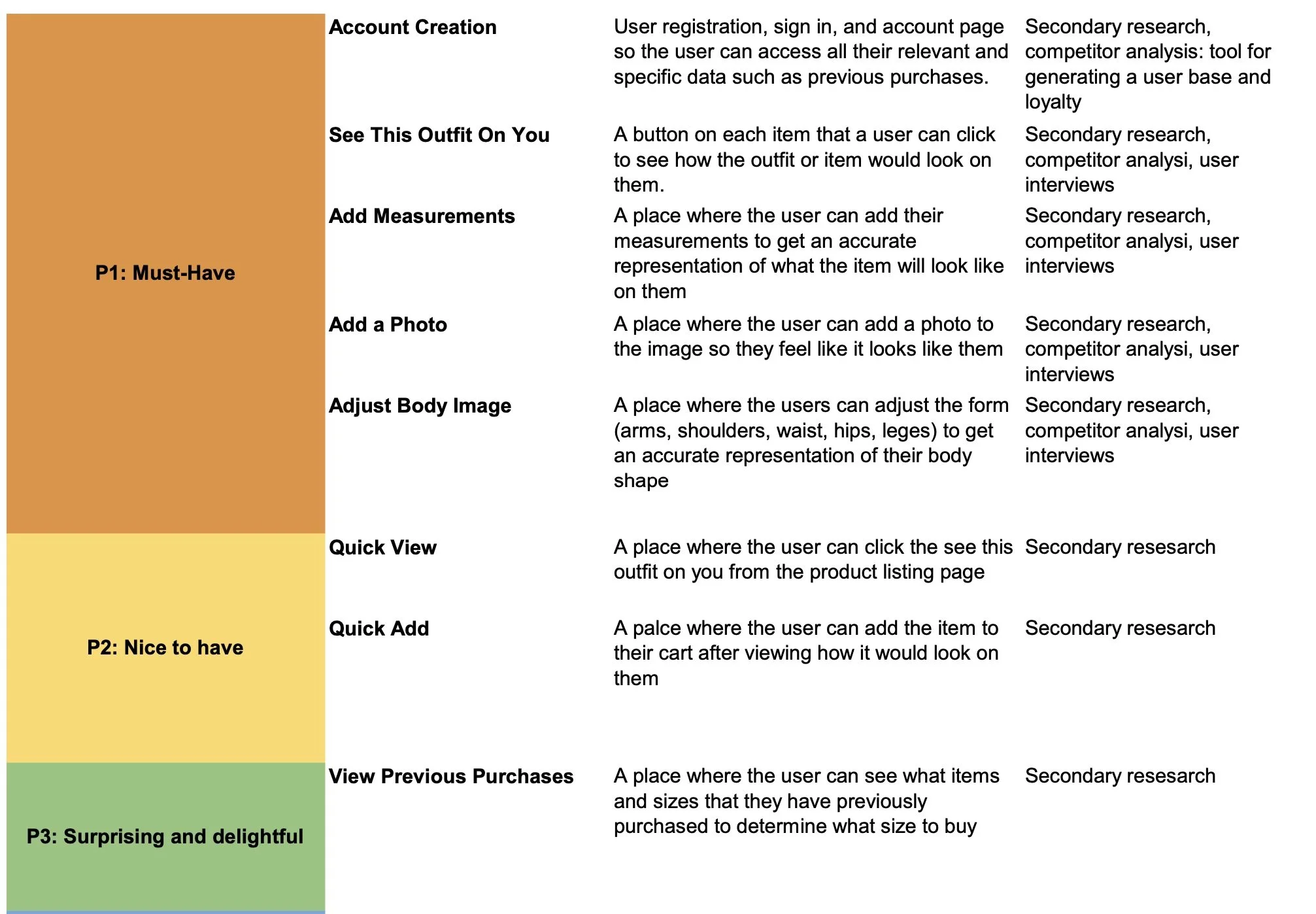 To validate my assumption that a virtual try on assistant would be an effective way to “try clothing on” before purchasing, it was important to understand what key features consumers would need and identify any pain points consumers might face while completing a virtual try on session.